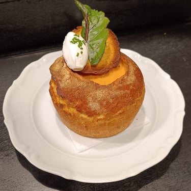 Για αρχή, μια βελουτέ σούπα από γλυκιά κολοκύθα, γλυκοπατάτα και παντζάρι, συνοδευόμενη από μία απαλή σως από σαούρ κρεμ. Οι γλυκές και γήινες γεύσεις της σούπας σε συνδυασμό με την δροσερή και κρεμώδη σως, δημιούργησαν έναν γαστρονομικό καμβά που ενθουσίασε κάθε ουρανίσκο.