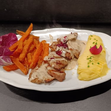 Χοιρινό Φιλέτο με Στικ Γλυκοπατάτας και Σως Μήλου και Ράσμπερι
