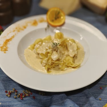 Φρέσκα Πουγκιά (με τυριά και καραμελωμένο αχλάδι σε λευκή σάλτσα με γκοργκοντζόλα)
