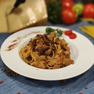 Linguine con carne (μαγειρεμένα σε κόκκινη σάλτσα με χοιρινά καρεδάκι και μανιτάρια)