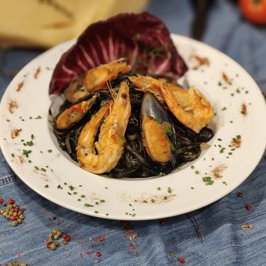 Linguine με Γαρίδες και Μύδια (με σάλτσα από μελάνι σουπιάς )